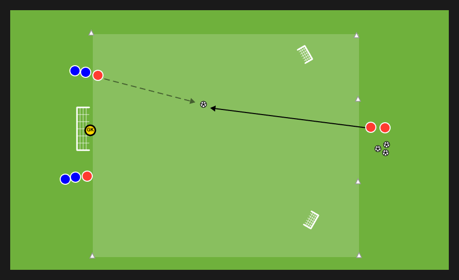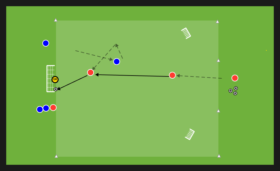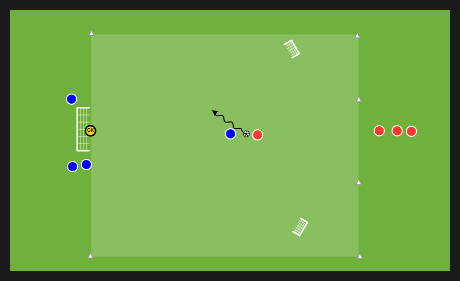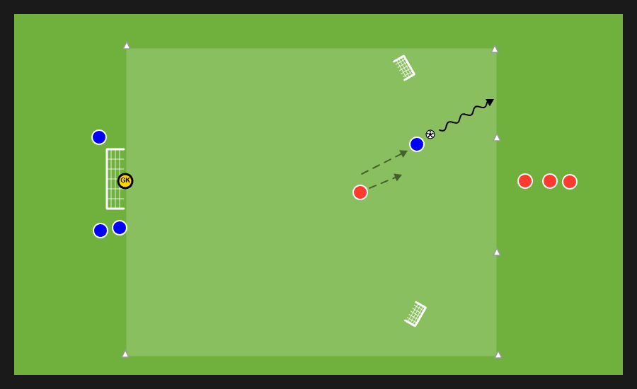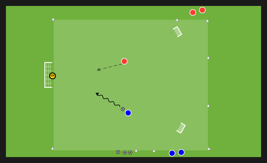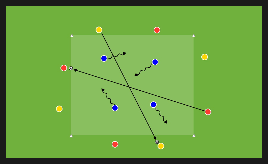 Delle tre squadre presenti, due si affrontano in un possesso palla e la terza invece svolge la funzione jolly, di cui quattro uomini con funzione di sponde ai lati dell’area di gioco e un jolly dentro. Dopo un numero di passaggi stabilito dal mister la squadra in possesso può cercare una delle sponde disposte verticalmente e proporsi nello spazio al di fuori dell’area in cui si svolge il possesso per andare al tiro.