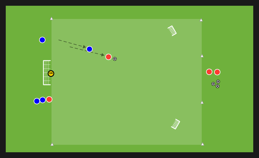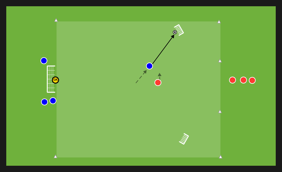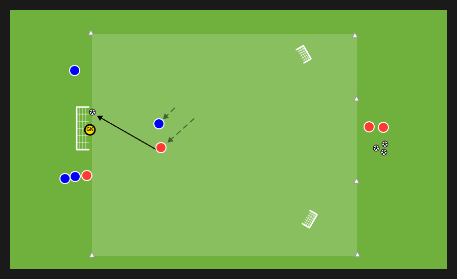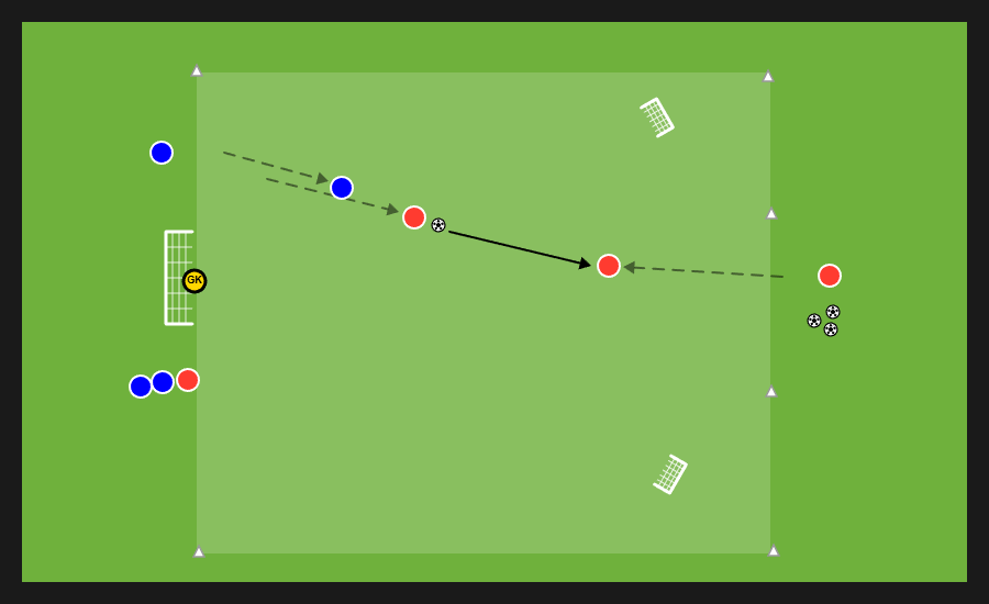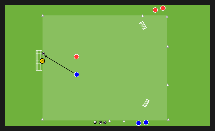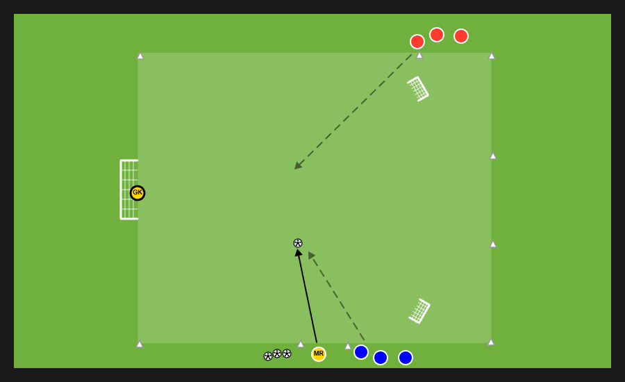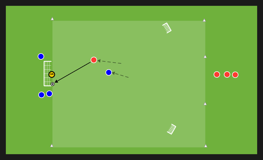 Delle tre squadre presenti, due si affrontano in un possesso palla e la terza invece svolge la funzione jolly, di cui quattro uomini con funzione di sponde ai lati dell’area di gioco e un jolly dentro. Dopo un numero di passaggi stabilito dal mister la squadra in possesso può cercare una delle sponde disposte verticalmente e proporsi nello spazio al di fuori dell’area in cui si svolge il possesso per andare al tiro.