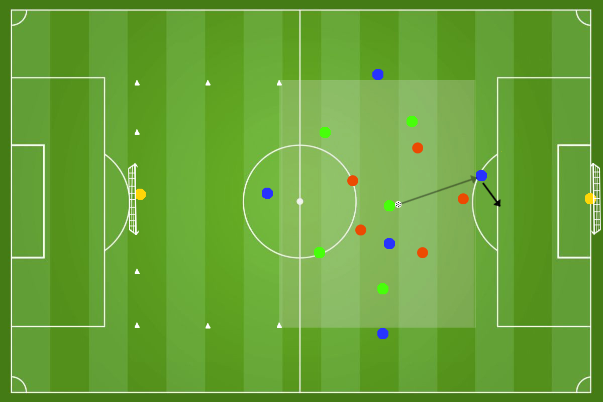 Delle tre squadre presenti, due si affrontano in un possesso palla e la terza invece svolge la funzione jolly, di cui quattro uomini con funzione di sponde ai lati dell’area di gioco e un jolly dentro. Dopo un numero di passaggi stabilito dal mister la squadra in possesso può cercare una delle sponde disposte verticalmente e proporsi nello spazio al di fuori dell’area in cui si svolge il possesso per andare al tiro.