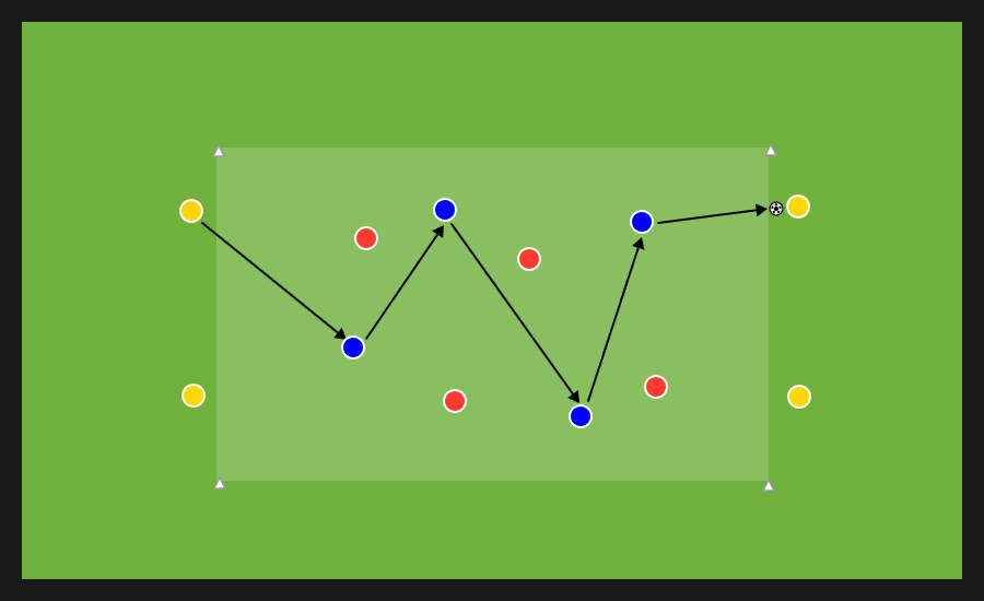 Due squadre si affronteranno dentro l’area di gioco mentre una si disporrà all’esterno, un giocatore per lato e giocherà con la squadra in possesso palla. Ogni tot. minuti il mister farà ruotare le squadre in modo tale che ognuna delle 3 squadre svolga un turno all’esterno e 2 all’interno.