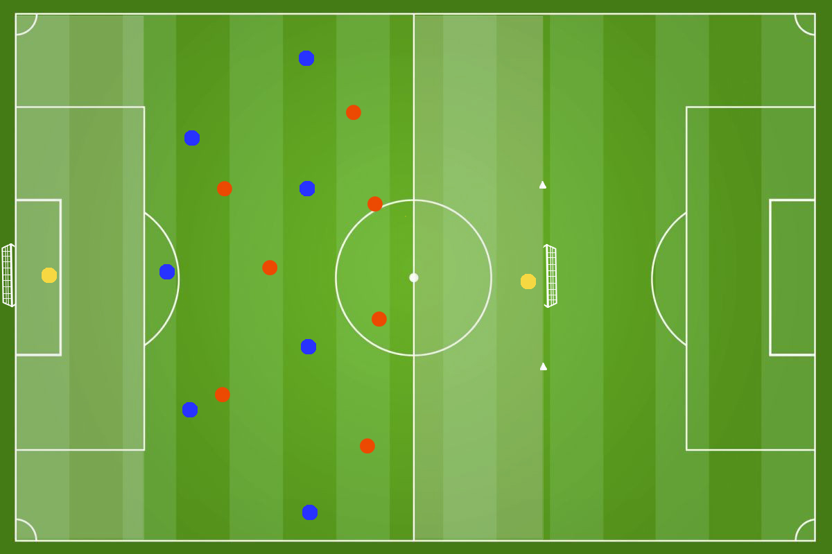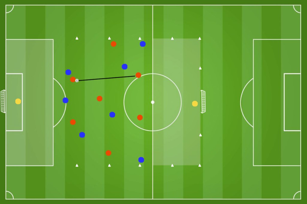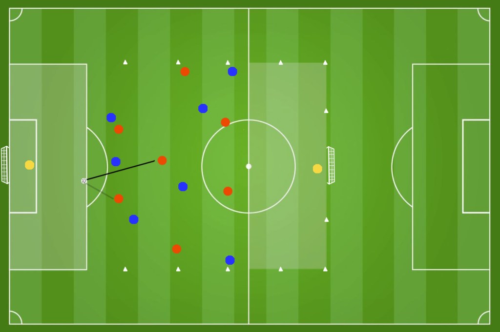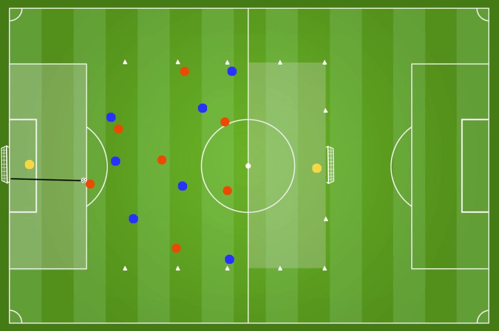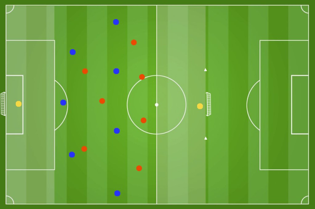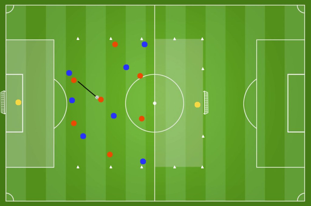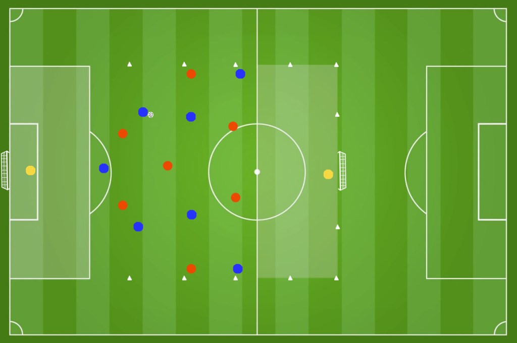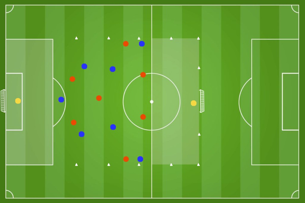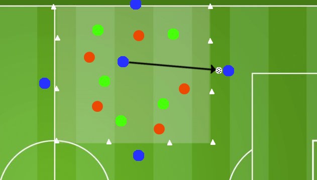 In un campo diviso in 2 settori come in figura (circa 22m x 18m ) disponiamo 2 squadre da 4 giocatori ciascuna. Il numero dei giocatori, lo spazio di gioco e la durata dell’esercizio può essere regolata in base alle esigenze dell’allenatore. Ricordiamoci che riducendo gli spazi andiamo a lavorare maggiormente sulla forza.