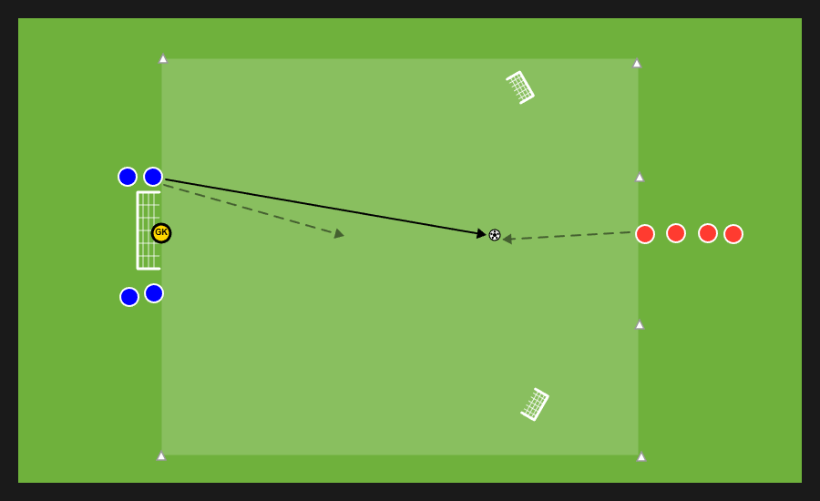 Porre a confronto un gruppo di difendenti e un gruppo di attaccanti. I difendenti si troveranno come in immagine sulla linea di fondo in cui si trova il portiere e gli attaccanti di fronte a loro.